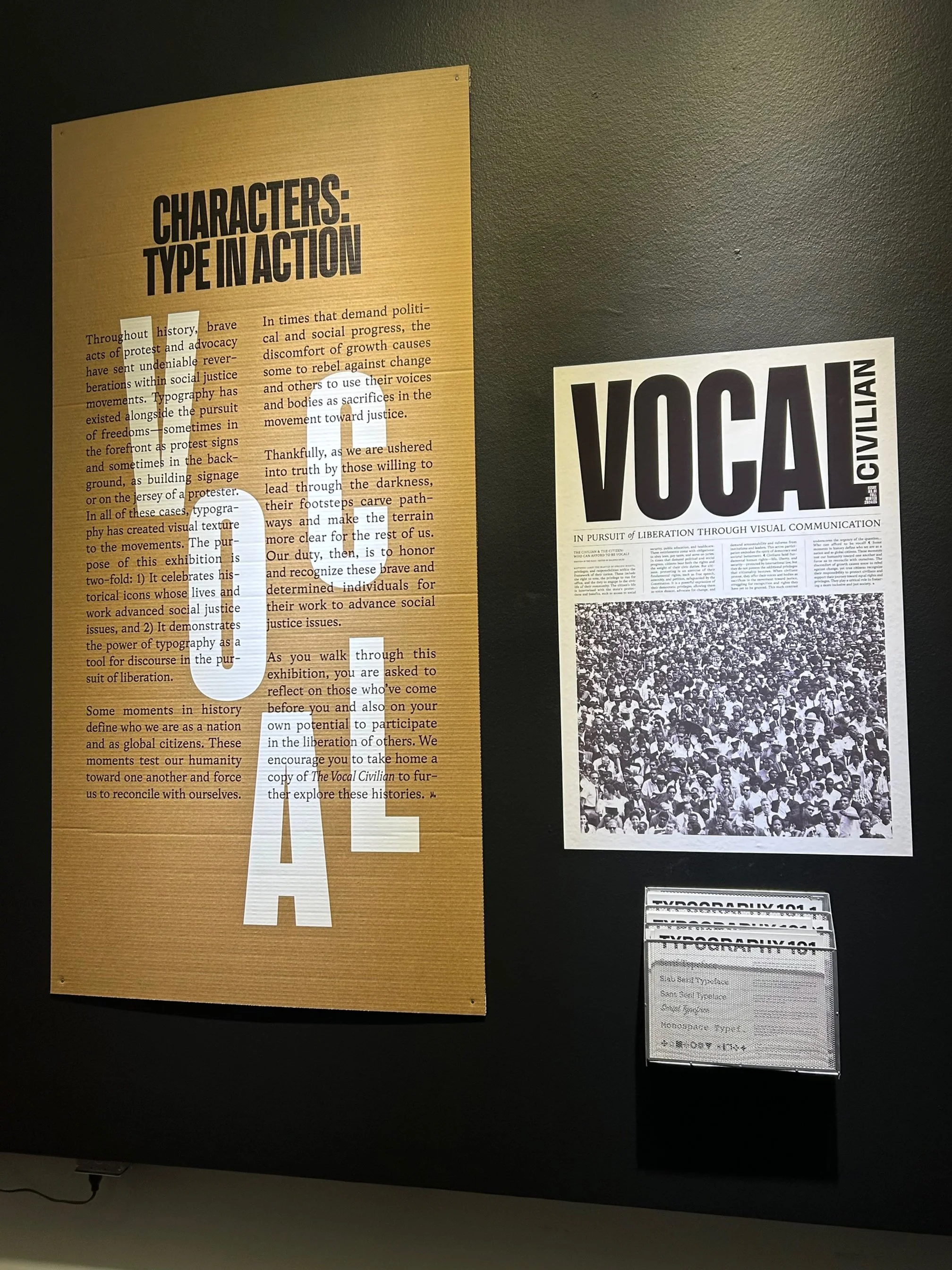 Characters: Type in Action showcases the work of Tré Seals, an independent design practitioner and founder of the diversity-driven type foundry, Vocal Type. Seals ties typography to pivotal historical moments, drawing attention to underrepresented races, ethnicities, or genders from civil rights and suffrage movements. By recontextualizing fonts, the exhibit demonstrates how typefaces can be functional, decorative, and important tools for activism.